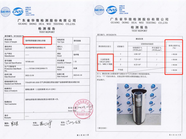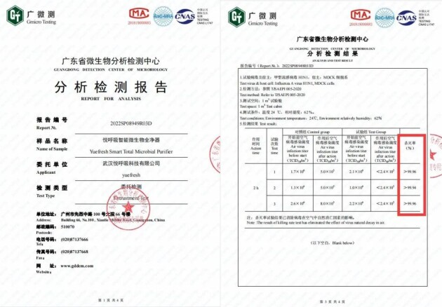 經權威機構廣東省華微檢測股份有限公司檢測報告悅呼吸智能微生物全凈器對冠狀病毒的去除率高達99.99%,對甲型H1N1病毒去除率也高達99.96%。