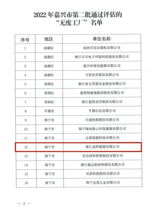 無廢工廠是創(chuàng)建“無廢城市”的一個重要單元。近日,嘉興市第二批“無廢工廠”評估結(jié)果名單公布,袁花鎮(zhèn)的浙江晶科能源有限公司榜上有名。這是晶科能源繼工信部綠色工廠、嘉興優(yōu)秀環(huán)保企業(yè)之后,獲得的新的榮譽稱號,標志著企業(yè)在工業(yè)廢物減量化、資源化、無害化有了新的突破。