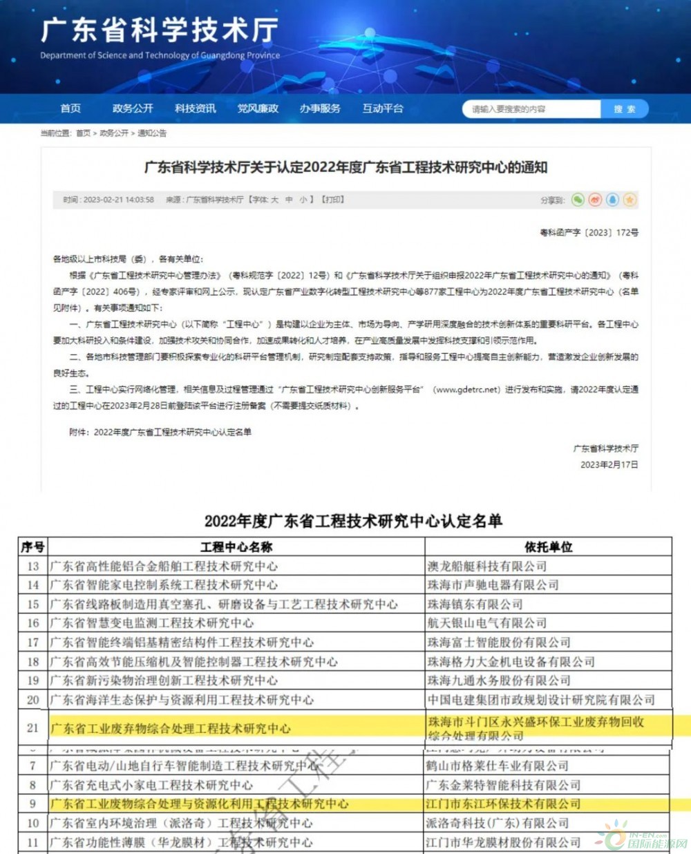 廣東省科技廳公布2022年度廣東省工程技術(shù)研究中心名單,東江環(huán)保所屬珠海市斗門區(qū)永興盛環(huán)保工業(yè)廢棄物回收綜合處理有限公司、江門市東江環(huán)保技術(shù)有限公司(簡稱“珠海永興盛、江門東江”)分別獲得“廣東省工業(yè)廢棄物綜合處理工程技術(shù)研究中心”“廣東省工業(yè)廢物綜合處理與資源化利用工程技術(shù)研究中心”認(rèn)定。