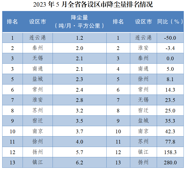 為進一步推進全省環(huán)境空氣質(zhì)量改善,按期保質(zhì)完成年度大氣污染防治攻堅目標任務(wù),江蘇省生態(tài)環(huán)境廳每月對13個設(shè)區(qū)市降塵量進行排名。