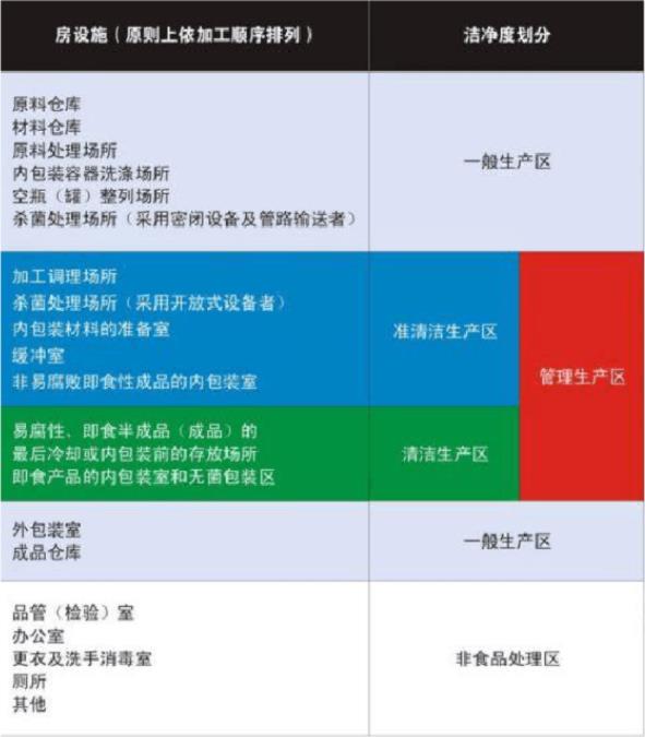 準(zhǔn)潔凈生產(chǎn)區(qū)指加工調(diào)理場等潔凈度要求次于潔凈生產(chǎn)區(qū)的操作區(qū)域,包括食品加工調(diào)理場[如從事切割、磨碎、混合、調(diào)配、整形、成型、烹調(diào)及萬分萃取、改進(jìn)食品特性或保存性(如提油、淀粉分離、豆沙制造、乳化、凝固或發(fā)酵、殺菌、冷凍或干燥等)等處理生產(chǎn)的場所]、內(nèi)包裝材料的準(zhǔn)備室(指不必經(jīng)任何清洗消毒程序即可直接使用的內(nèi)包裝材料,進(jìn)行拆除外包裝或成型等的操作場所)、緩沖室(指原材料或半成品未經(jīng)過正常制造流程而直接進(jìn)入管制生產(chǎn)區(qū)時(shí),為避免管制生產(chǎn)區(qū)直接與外界相通,于入口處所設(shè)置的緩沖場所)。