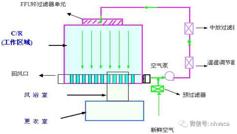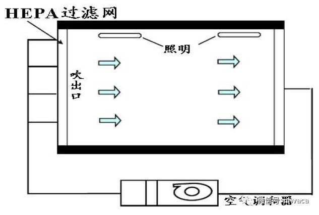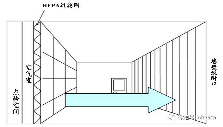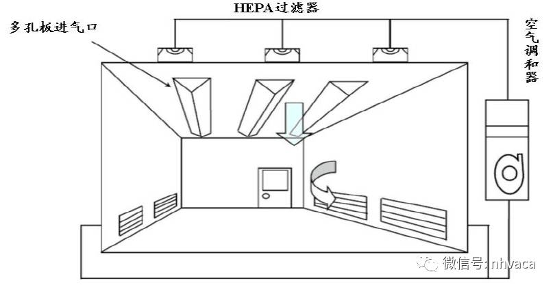通過(guò)凈化車間屋頂?shù)母咝н^(guò)濾器出口向屋內(nèi)送風(fēng).通過(guò)墻壁的排氣口回風(fēng),以玻璃纖維為主
