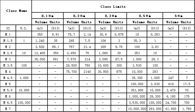 其中X是無(wú)塵車間的等級(jí),例如100或10000等等,Y是粒徑如0.2μm , 0.5μm等,可復(fù)選。意思就是使用者規(guī)定,該無(wú)塵室微粒含量,在這些粒徑必須滿足該等級(jí)的限度。