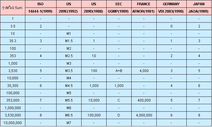 基于≥0.5um粒徑的各國(guó)潔凈度等級(jí)近似對(duì)照表