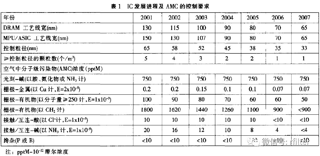 隨著lC生產(chǎn)的飛速發(fā)展,其加工的特征尺寸越來越微細(xì)化,去除空氣中的AMC( airbome molecular contamination)問題越來越受到人們關(guān)注,國際半導(dǎo)體制造技術(shù)協(xié)會(SEMATECH)及其他機(jī)構(gòu)、組織對IC生產(chǎn)中AMC的危害和允許濃度分別進(jìn)行了分析預(yù)測,表l是SEMATECH所預(yù)測的國際半導(dǎo)體發(fā)展進(jìn)程及相應(yīng)的AMC的要求。一些研究結(jié)果表明,空氣中的金屬離子(Na、K、Fe、Cu、Zn等)會破壞絕緣層,使p-n結(jié)漏電;而氮氧化物、二氧化硫、氨、有機(jī)物、臭氧、硼、磷等都會引起電路缺陷。AMC已直接影響到產(chǎn)品的成品率和可靠性,所以應(yīng)加以控制。