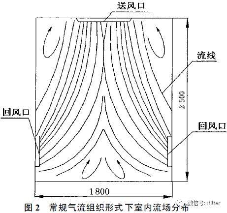 1000 級無塵車間常規(guī)送、回風(fēng)方式下造成的室內(nèi)氣流分布見圖2[2]。室內(nèi)大部分區(qū)域, 尤其是工作區(qū)(距地面1 ~ 1 .5 m 左右的區(qū)域)處于主流區(qū)。因為通常