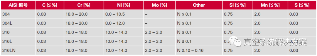 歐洲常用鋼號(hào)可與AISI(美國鋼鐵協(xié)會(huì))類似材料名稱通用,如1.4301對(duì)應(yīng)304、1.4307和1.4306對(duì)應(yīng)304L、1.4404和1.4435對(duì)應(yīng)316L以及1.4429對(duì)應(yīng)316LN。不過,材料只是大約類似。真空應(yīng)用的差異大多是非常微小的。然而,對(duì)于特殊要求,必須針對(duì)個(gè)別情況單獨(dú)評(píng)估通用性。示例:如果某個(gè)部件需要材料1.4301,一般必須有相關(guān)材料證書。如果證書只顯示材料304,則未滿足要求。此時(shí),證書中的名稱很重要。如果滿足相應(yīng)的材料規(guī)格,制造商也可證明半成品具有幾個(gè)名稱。例如,如果材料被證明為1.4301、1.4307、304和304L,用途則會(huì)更加多樣化。