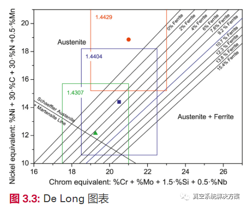 在圖3.3中,對(duì)于某些不銹鋼,顯示了鉻和鎳當(dāng)量區(qū)域(彩色矩形),并以圖標(biāo)給出其平均當(dāng)量。