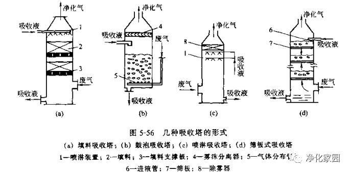 在產(chǎn)品生產(chǎn)中的濕法化學腐蝕、酸液清洗、實驗室內(nèi)均有酸性氣體排出,在這類酸性氣體的排風系統(tǒng)通常設置溫式洗氣吸收塔,處理后排入大氣,圖5-56是幾種吸收式洗氣塔的形式。實際設計時應根據(jù)酸性氣體的類型、濃度選用合適的吸收液和吸收塔的形式[20]。