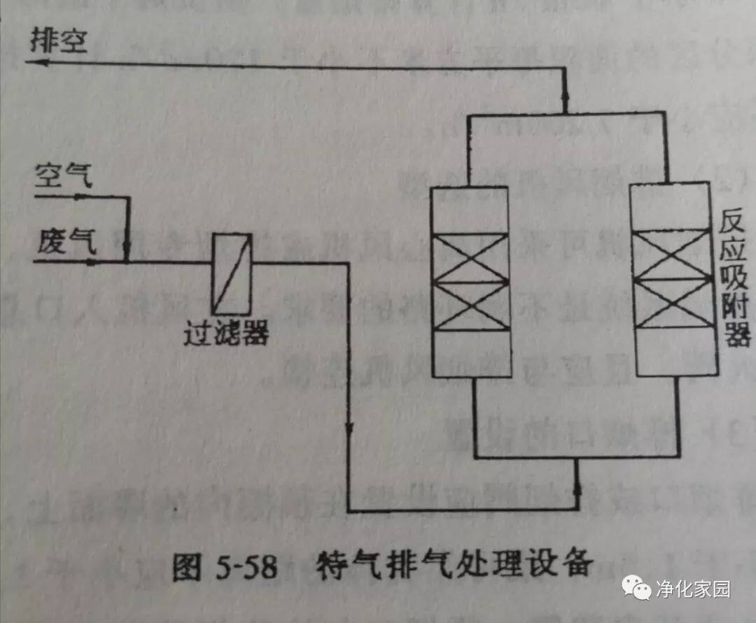 圖5-58是一種特氣處理設備,首先在催化反應段中,將有害成分催化反應(燃燒)后,再送入吸附段吸附去除各類催化反應生成物,達到排放標準后排入大氣。吸附劑按設計要求定期再生、活化恢復吸附能力。