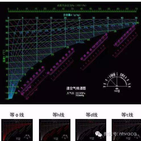 圖中:等φ線是曲線,等h線是傾斜直線,等d線是垂直線,等t線接近水平,看似平行,實際互不平行。水蒸氣分壓力(Pq)標尺為水平線。最低的一根等φ線,其值為φ=100%。這條曲線稱為飽和線。狀態(tài)在這條線上的空氣處于飽和狀態(tài)。在其他φ線上的空氣都是非飽和的。空氣狀態(tài)不可能位于飽和線以下的區(qū)域中。