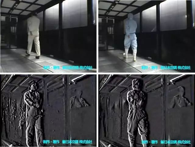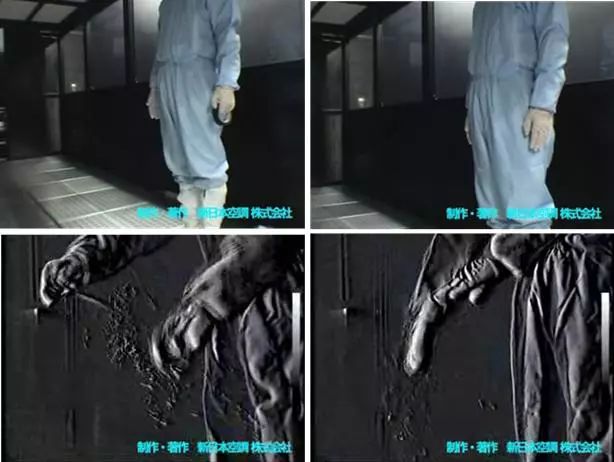 左邊是穿一般的工作服走路時候發(fā)塵的樣子。右邊是穿潔凈服走路時候發(fā)塵的樣子。