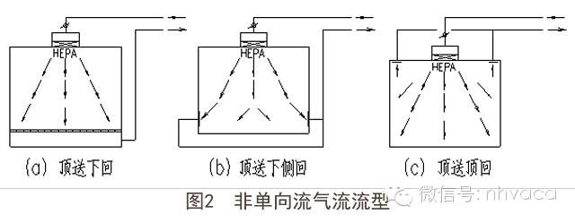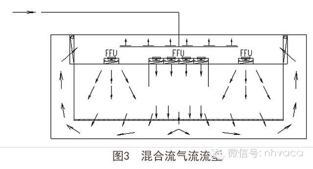 混合流氣流是將垂直單向流和非單向流兩種氣流組合在一起構(gòu)成的氣流流型。這種氣流的特點是將垂直單向流面積壓縮到最小,用大面積非單向流替代大面積單向流以利節(jié)省初投資和運行費。
