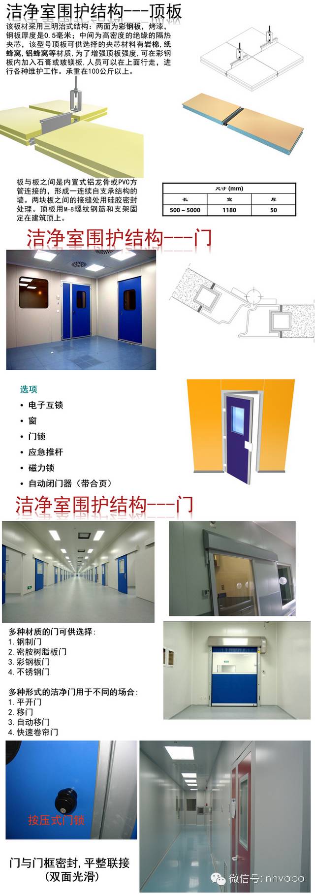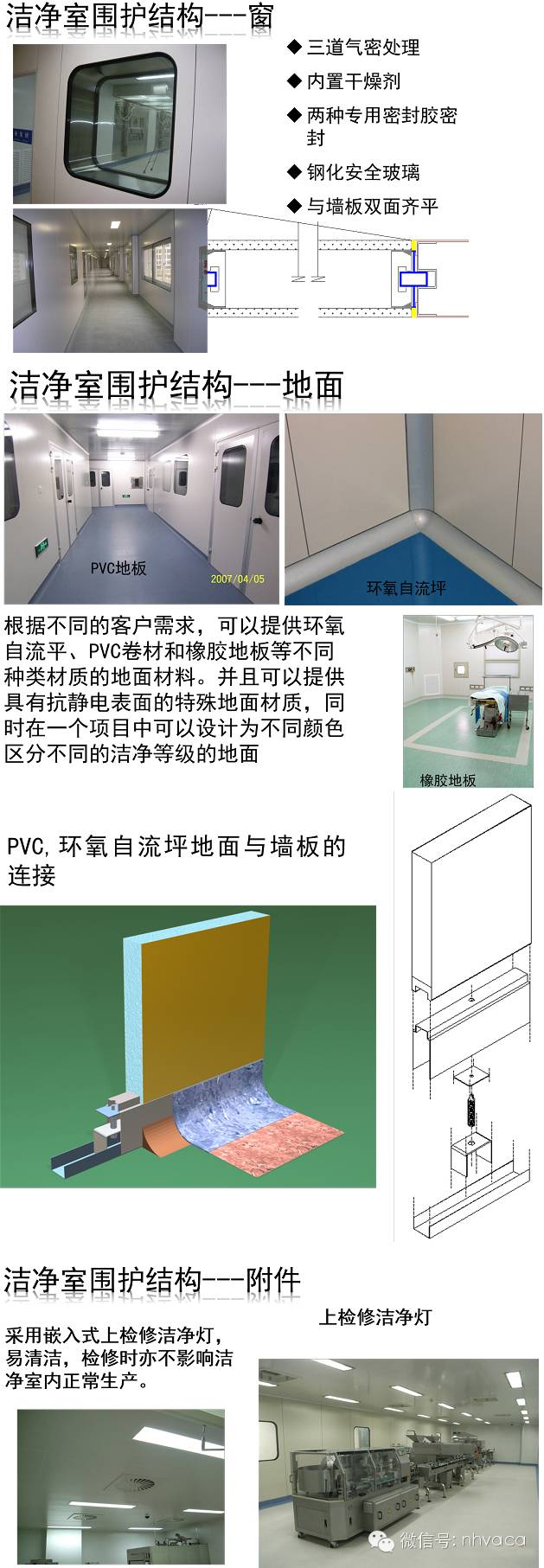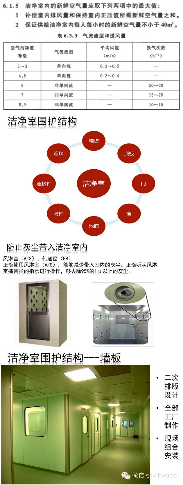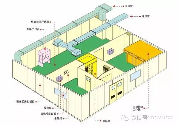 潔凈室的系統(tǒng)構(gòu)成:大風(fēng)量的循環(huán)空氣(考慮局部排氣)和高性能的過濾器;符合需要的控制溫濕度的空調(diào)設(shè)備(要考慮內(nèi)部發(fā)熱);設(shè)置控制外部塵埃帶入室內(nèi)的風(fēng)淋室,傳遞窗等設(shè)備。四周不易粘附塵埃,表面光滑,潔凈的房間。