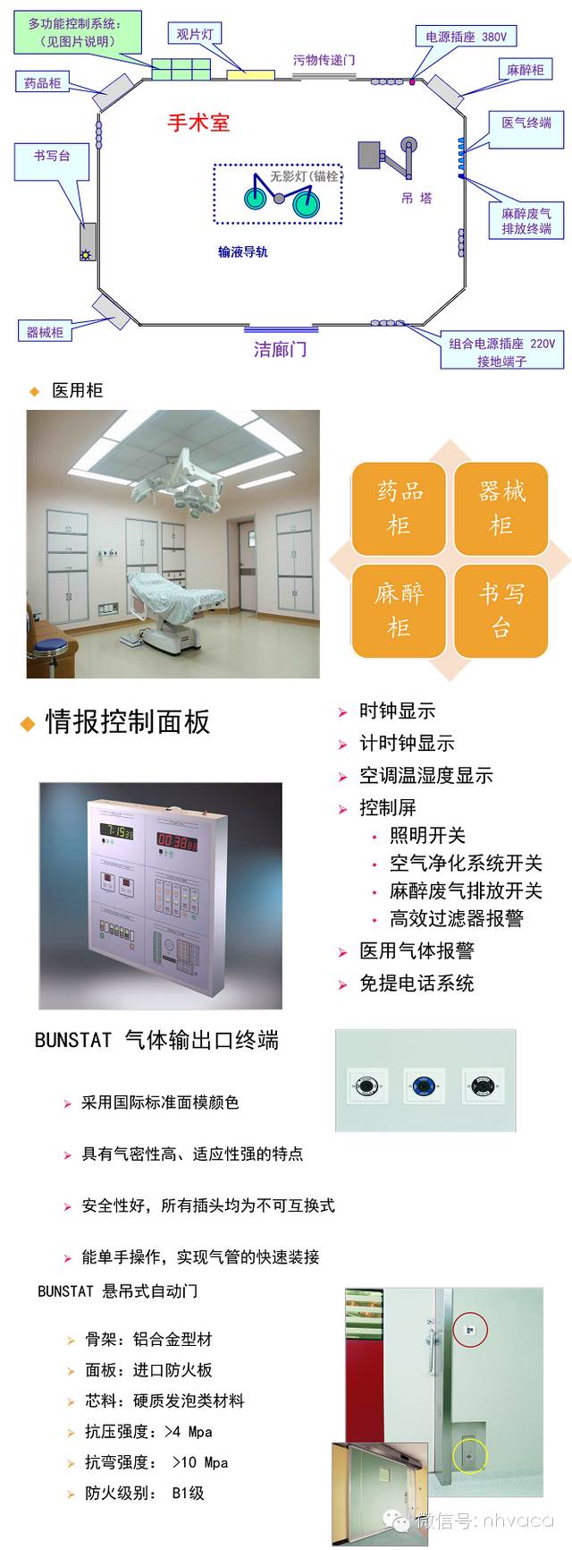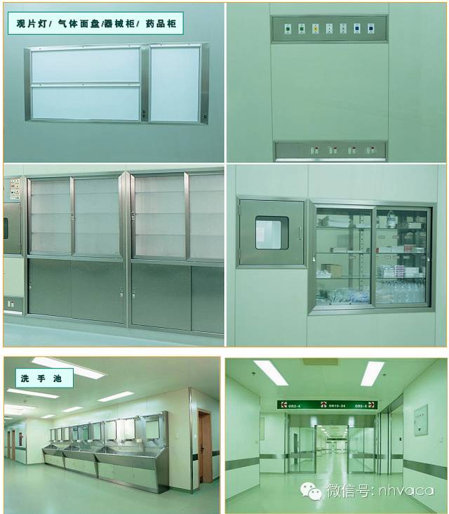 手術(shù)室內(nèi)、藥品柜、器械柜、麻醉柜、書寫臺、X光觀片燈、多功能控制面板、醫(yī)用氣體系統(tǒng)、其他裝備、氣密封自動門、洗手池、無影燈、吊塔。