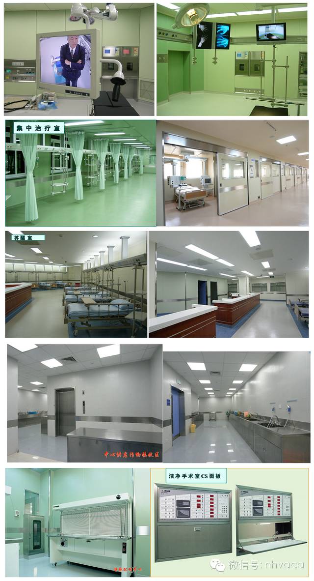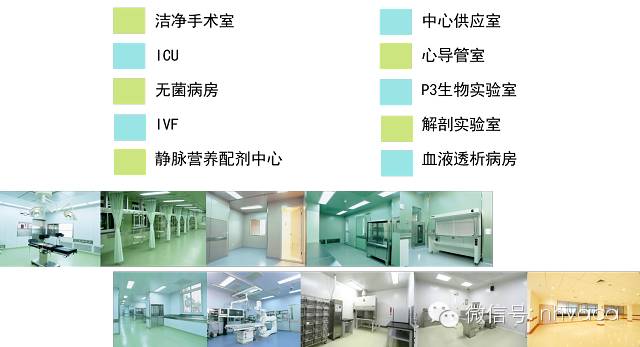 凈化手術(shù)部、凈化層流病房、ICU---EICU(急診)、PICU(兒科重癥)、CICU(心臟監(jiān)護室)、NICU(新生兒監(jiān)護室)、SICU(外科重癥)、CCU(心內(nèi)科監(jiān)護室)、中心供應(yīng)室、靜脈配置中心、解剖室、IVF(體外受精-胚胎移植)、病理科、檢驗科、制劑室。