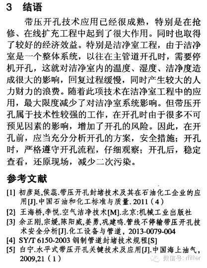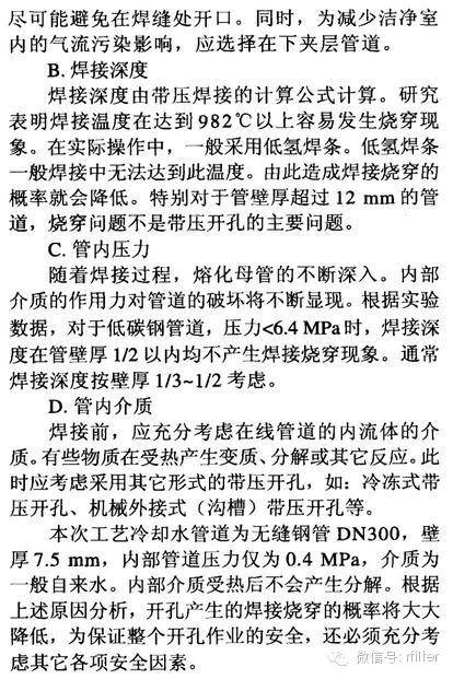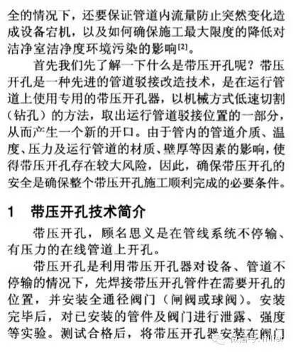 摘要:潔凈室運(yùn)行后,由于生產(chǎn)工藝的改變,產(chǎn)能的擴(kuò)充,需要對(duì)原在線工藝?yán)鋮s水管道系統(tǒng)進(jìn)行開孔。原在線管道在沒有預(yù)留閥門的條件下,采用帶壓開孔技術(shù)是提高效率、降低成本的重要技術(shù)。而帶壓開孔技術(shù)受到管內(nèi)壓力、溫度、壁厚等因素的影響,造成帶壓開孔施工存在一定的施工風(fēng)險(xiǎn)。