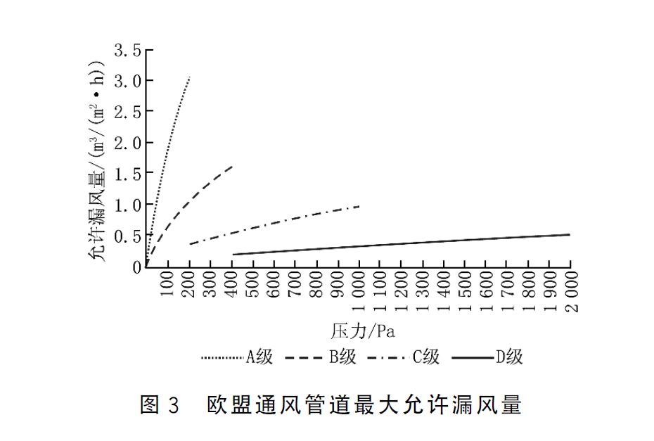 歐盟通風(fēng)管道氣密性劃分為4個(gè)等級(jí),其中D級(jí)為特殊管道專用氣密性等級(jí),4個(gè)漏風(fēng)常數(shù)相鄰之間也為3倍關(guān)系,并且A,B,C級(jí)的漏風(fēng)常數(shù)和我國(guó)的低、中、高壓等級(jí)的漏風(fēng)常數(shù)對(duì)應(yīng)相比低約8%;