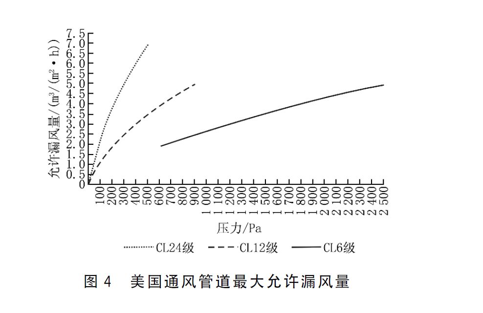 總體來(lái)說(shuō),中美風(fēng)管氣密性等級(jí)下的壓力總范圍相同,各等級(jí)壓力區(qū)間不同,我國(guó)最大允許漏風(fēng)量曲線較美國(guó)平緩,最大允許漏風(fēng)量中國(guó)<美國(guó),我國(guó)氣密性等級(jí)高于美國(guó)。