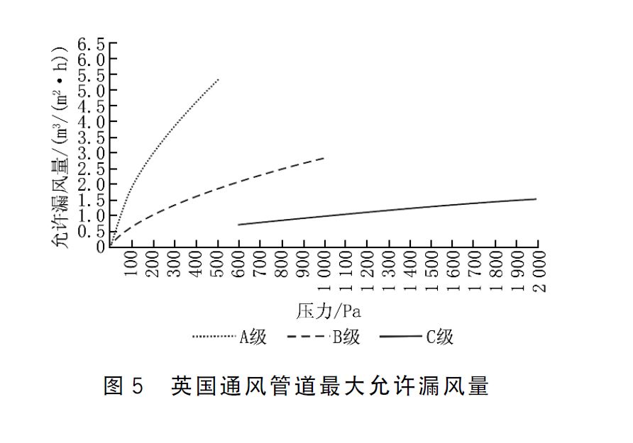 我國(guó)通風(fēng)系統(tǒng)管道的低壓/A級(jí)、中壓/B級(jí)和高壓/C級(jí)風(fēng)管對(duì)應(yīng)英國(guó)通風(fēng)系統(tǒng)管道的A級(jí)、B級(jí)和C級(jí),最大允許漏風(fēng)量曲線變化趨勢(shì)基本相同