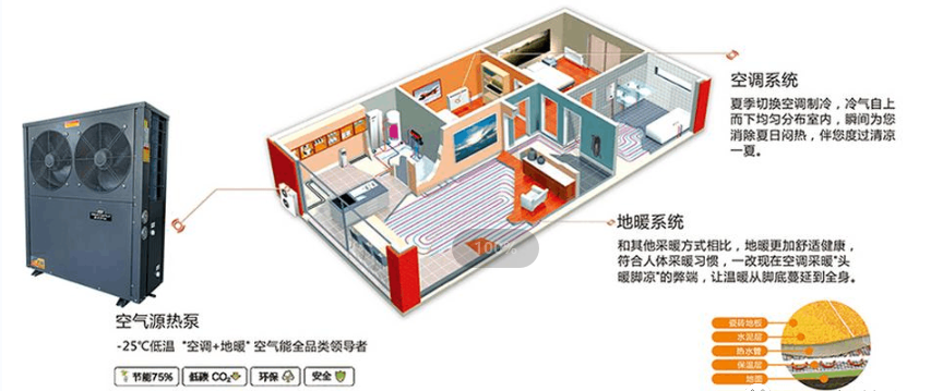 “空氣能地暖機組”一機三用,冬天采暖,夏天制冷,熱回收用于家庭生活熱水,無需采購多種設(shè)備,減少初期投資。