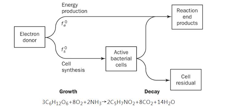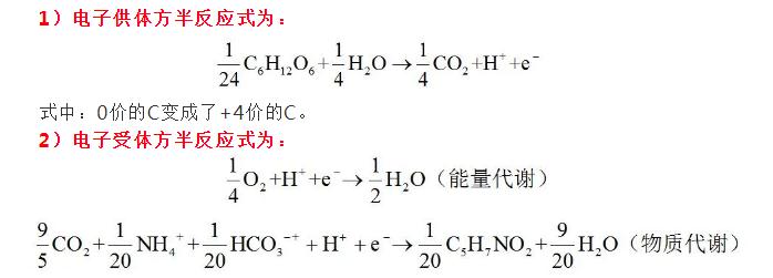 任何氧化還原反應,都是由兩方參與的,電子供體方(氧化反應)和電子受體方(還原反應),參與的兩方必須保證電荷守恒。好氧環(huán)境下,C6H12O6作為外碳源,是提供電子供體的一方,它提供的電子有兩個去處,去用于產能(能量代謝),去用于微生物的增殖(物質代謝),下式為C6H12O6同時參與能量代謝及物質代謝的綜合表達式。