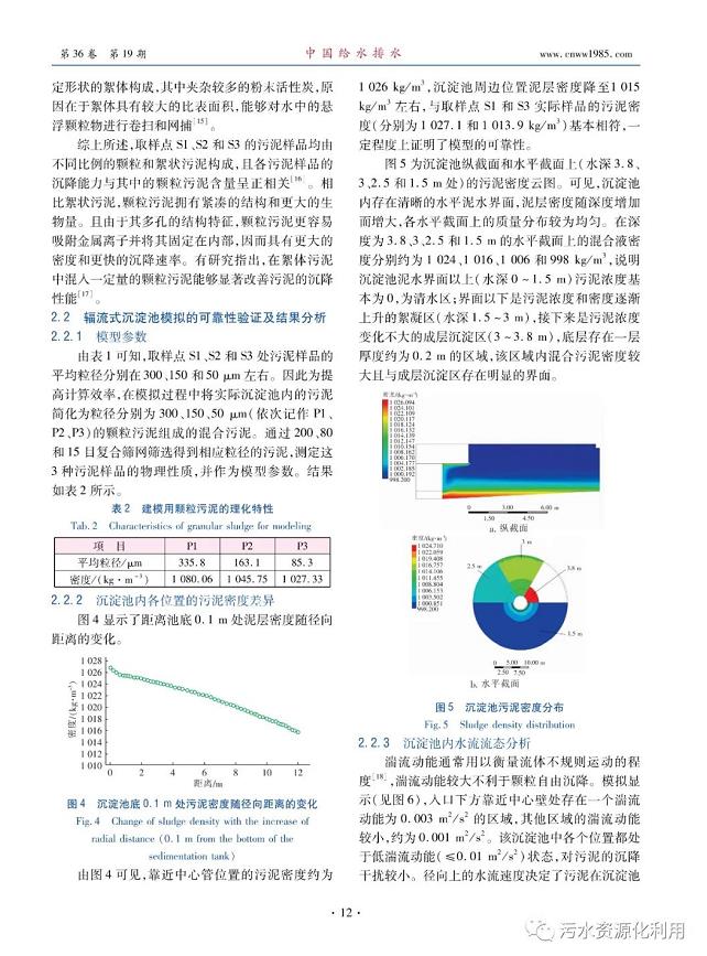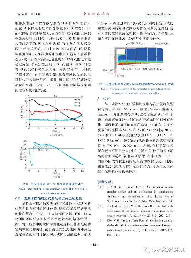 摘要:選取一座已初步形成好氧顆粒污泥的工業(yè)污水處理廠的輻流式沉淀池為研究對象,結(jié)合實(shí)際運(yùn)行情況建立固液二相流模型,分析沉淀池內(nèi)活性污泥的沉降性能和分布規(guī)律。從沉淀池底徑向距離中心1、6和12 m處取得3個(gè)污泥樣本S1、 S2和S3,其中S1的平均粒徑(294.6 μm)遠(yuǎn)高于S2(142.8 μm)和S3(55.2 μm),對應(yīng)的污泥指數(shù)(SVI)分別為56.2、63.4和81.3 mL/g。綜合試驗(yàn)結(jié)果和計(jì)算流體力學(xué)(CFD)模擬結(jié)果可以發(fā)現(xiàn),沉淀池內(nèi)顆粒污泥主要集中在半徑為1~6 m的圓環(huán)區(qū)域內(nèi)。因此,可以通過選擇性回流中心區(qū)域內(nèi)的顆粒污泥來制造選擇壓,從而實(shí)現(xiàn)連續(xù)流工藝的污泥顆?;?/p>